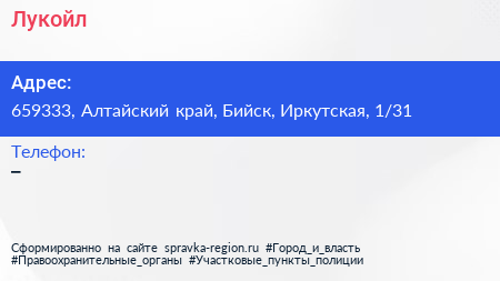 Лукойл по адресу 659333, Алтайский край, Бийск, Иркутская, 1/31 в дальнейшем Организация, размещена в следующих категориях: