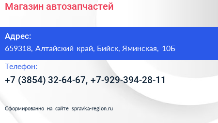 Магазин автозапчастей по адресу 659318, Алтайский край, Бийск, Яминская, 10Б в дальнейшем Организация, размещена в следующих категориях: