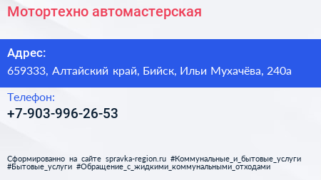 Мотортехно, автомастерская по адресу 659333, Алтайский край, Бийск, Ильи Мухачёва, 240а в дальнейшем Организация, размещена в следующих категориях: