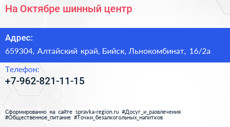 На Октябре, шинный центр по адресу 659304, Алтайский край, Бийск, Льнокомбинат, 16/2а в дальнейшем Организация, размещена в следующих категориях: