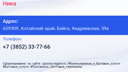 Ника по адресу 659309, Алтайский край, Бийск, Андреевская, 39а в дальнейшем Организация, размещена в следующих категориях: