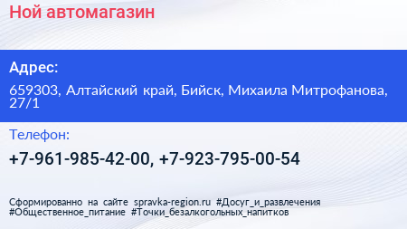 Ной, автомагазин по адресу 659303, Алтайский край, Бийск, Михаила Митрофанова, 27/1 в дальнейшем Организация, размещена в следующих категориях: