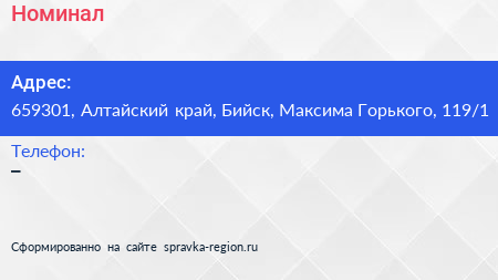 Номинал по адресу 659301, Алтайский край, Бийск, Максима Горького, 119/1 в дальнейшем Организация, размещена в следующих категориях: