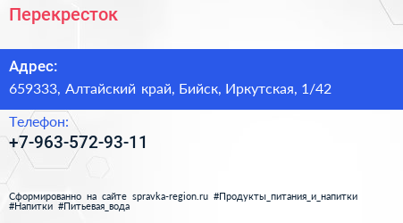 Перекресток по адресу 659333, Алтайский край, Бийск, Иркутская, 1/42 в дальнейшем Организация, размещена в следующих категориях: