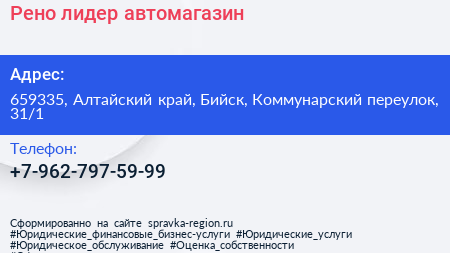 Рено-лидер, автомагазин по адресу 659335, Алтайский край, Бийск, Коммунарский переулок, 31/1 в дальнейшем Организация, размещена в следующих категориях: