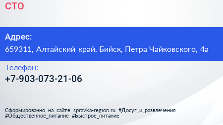 СТО по адресу 659311, Алтайский край, Бийск, Петра Чайковского, 4а в дальнейшем Организация, размещена в следующих категориях: