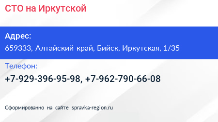 СТО на Иркутской по адресу 659333, Алтайский край, Бийск, Иркутская, 1/35 в дальнейшем Организация, размещена в следующих категориях:
