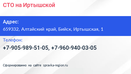 СТО на Иртышской по адресу 659332, Алтайский край, Бийск, Иртышская, 1 в дальнейшем Организация, размещена в следующих категориях: