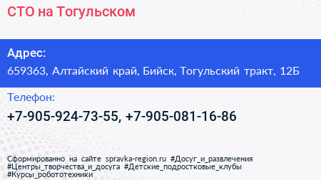 СТО на Тогульском по адресу 659363, Алтайский край, Бийск, Тогульский тракт, 12Б в дальнейшем Организация, размещена в следующих категориях: