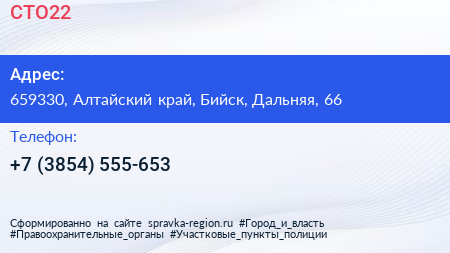 СТО22 по адресу 659330, Алтайский край, Бийск, Дальняя, 66 в дальнейшем Организация, размещена в следующих категориях: