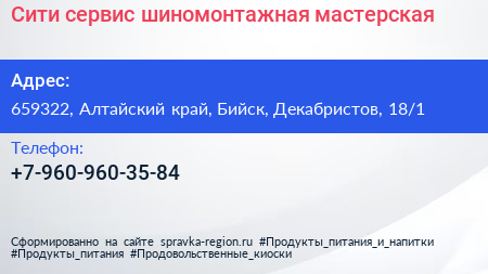 Сити-сервис, шиномонтажная мастерская по адресу 659322, Алтайский край, Бийск, Декабристов, 18/1 в дальнейшем Организация, размещена в следующих категориях:
