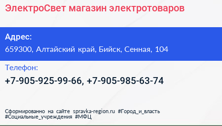 ЭлектроСвет, магазин электротоваров по адресу 659300, Алтайский край, Бийск, Сенная, 104 в дальнейшем Организация, размещена в следующих категориях:
