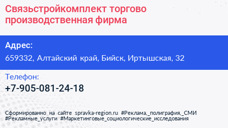Связьстройкомплект, торгово-производственная фирма по адресу 659332, Алтайский край, Бийск, Иртышская, 32 в дальнейшем Организация, размещена в следующих категориях: