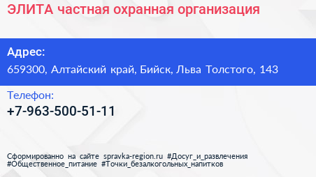 ЭЛИТА, частная охранная организация по адресу 659300, Алтайский край, Бийск, Льва Толстого, 143 в дальнейшем Организация, размещена в следующих категориях: