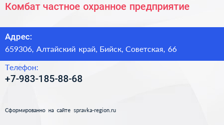 Комбат, частное охранное предприятие по адресу 659306, Алтайский край, Бийск, Советская, 66 в дальнейшем Организация, размещена в следующих категориях: