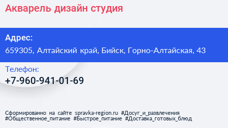 Акварель, дизайн-студия по адресу 659305, Алтайский край, Бийск, Горно-Алтайская, 43 в дальнейшем Организация, размещена в следующих категориях: