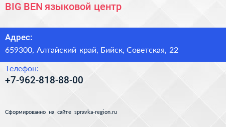 BIG BEN, языковой центр по адресу 659300, Алтайский край, Бийск, Советская, 22 в дальнейшем Организация, размещена в следующих категориях: