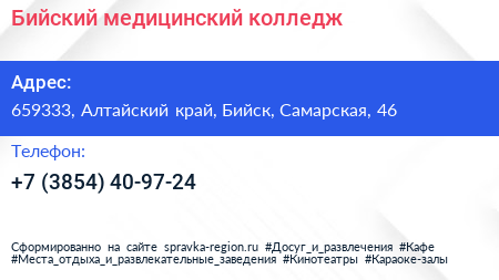 Бийский медицинский колледж по адресу 659333, Алтайский край, Бийск, Самарская, 46 в дальнейшем Организация, размещена в следующих категориях: