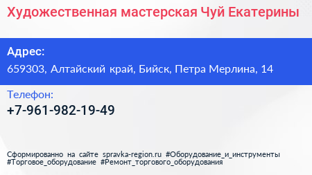 Художественная мастерская Чуй Екатерины по адресу 659303, Алтайский край, Бийск, Петра Мерлина, 14 в дальнейшем Организация, размещена в следующих категориях: