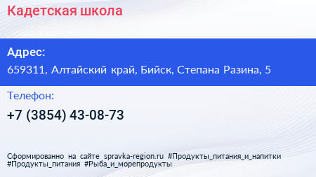 Кадетская школа по адресу 659311, Алтайский край, Бийск, Степана Разина, 5 в дальнейшем Организация, размещена в следующих категориях: