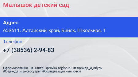Малышок, детский сад по адресу 659611, Алтайский край, Бийск, Школьная, 1 в дальнейшем Организация, размещена в следующих категориях: