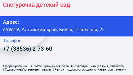 Снегурочка, детский сад по адресу 659619, Алтайский край, Бийск, Школьная, 25 в дальнейшем Организация, размещена в следующих категориях: