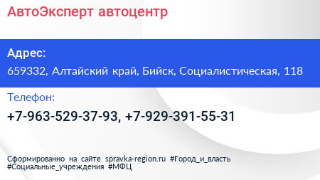 АвтоЭксперт, автоцентр по адресу 659332, Алтайский край, Бийск, Социалистическая, 118 в дальнейшем Организация, размещена в следующих категориях: