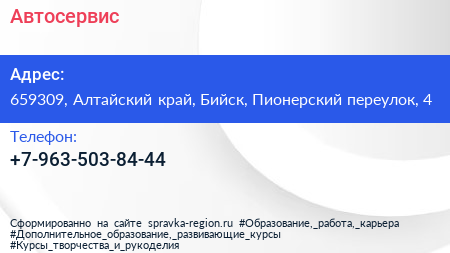 Автосервис по адресу 659309, Алтайский край, Бийск, Пионерский переулок, 4 в дальнейшем Организация, размещена в следующих категориях: