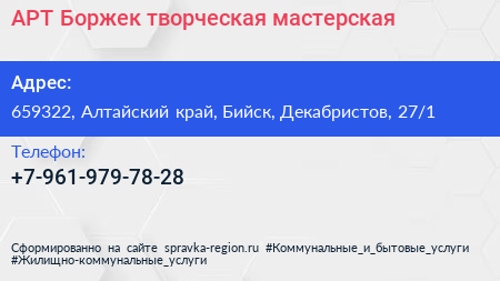 АРТ-Боржек, творческая мастерская по адресу 659322, Алтайский край, Бийск, Декабристов, 27/1 в дальнейшем Организация, размещена в следующих категориях: