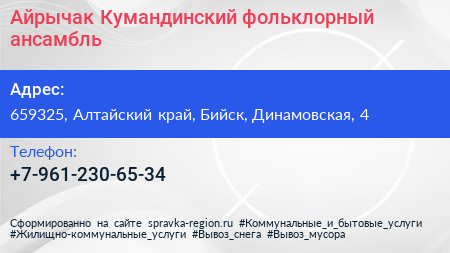 Айрычак, Кумандинский фольклорный ансамбль по адресу 659325, Алтайский край, Бийск, Динамовская, 4 в дальнейшем Организация, размещена в следующих категориях: