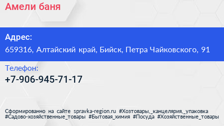 Амели, баня по адресу 659316, Алтайский край, Бийск, Петра Чайковского, 91 в дальнейшем Организация, размещена в следующих категориях: