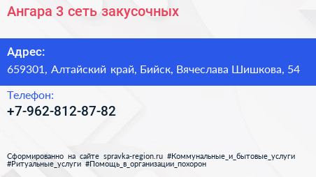 Ангара 3, сеть закусочных по адресу 659301, Алтайский край, Бийск, Вячеслава Шишкова, 54 в дальнейшем Организация, размещена в следующих категориях: