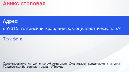 Аникс, столовая по адресу 659315, Алтайский край, Бийск, Социалистическая, 5/4 в дальнейшем Организация, размещена в следующих категориях: