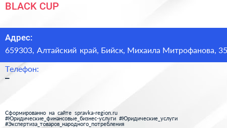 BLACK CUP по адресу 659303, Алтайский край, Бийск, Михаила Митрофанова, 35 в дальнейшем Организация, размещена в следующих категориях: