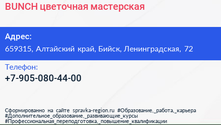 BUNCH, цветочная мастерская по адресу 659315, Алтайский край, Бийск, Ленинградская, 72 в дальнейшем Организация, размещена в следующих категориях: