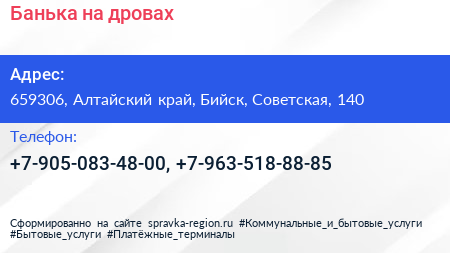 Банька на дровах по адресу 659306, Алтайский край, Бийск, Советская, 140 в дальнейшем Организация, размещена в следующих категориях: