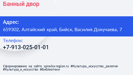 Банный двор по адресу 659302, Алтайский край, Бийск, Василия Докучаева, 7 в дальнейшем Организация, размещена в следующих категориях: