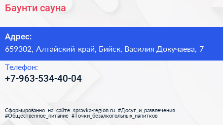 Баунти, сауна по адресу 659302, Алтайский край, Бийск, Василия Докучаева, 7 в дальнейшем Организация, размещена в следующих категориях: