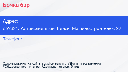 Бочка, бар по адресу 659321, Алтайский край, Бийск, Машиностроителей, 22 в дальнейшем Организация, размещена в следующих категориях: