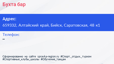 Бухта, бар по адресу 659332, Алтайский край, Бийск, Саратовская, 48 к1 в дальнейшем Организация, размещена в следующих категориях: