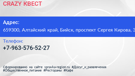 CRAZY КВЕСТ по адресу 659300, Алтайский край, Бийск, проспект Сергея Кирова, 3 в дальнейшем Организация, размещена в следующих категориях: