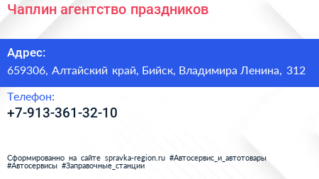Чаплин, агентство праздников по адресу 659306, Алтайский край, Бийск, Владимира Ленина, 312 в дальнейшем Организация, размещена в следующих категориях: