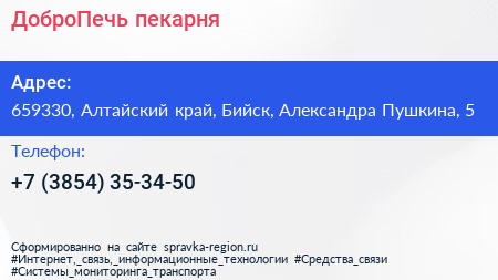 ДоброПечь, пекарня по адресу 659330, Алтайский край, Бийск, Александра Пушкина, 5 в дальнейшем Организация, размещена в следующих категориях: