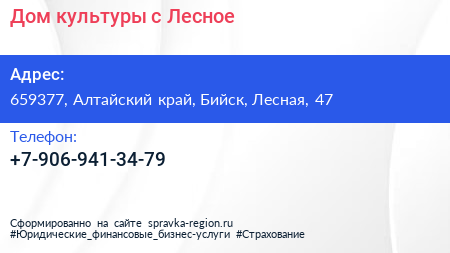 Дом культуры, с. Лесное по адресу 659377, Алтайский край, Бийск, Лесная, 47 в дальнейшем Организация, размещена в следующих категориях: