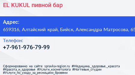 EL KUKUL, пивной бар по адресу 659316, Алтайский край, Бийск, Александра Матросова, 65 в дальнейшем Организация, размещена в следующих категориях: