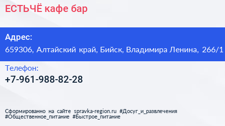 #ЕСТЬЧЁ, кафе-бар по адресу 659306, Алтайский край, Бийск, Владимира Ленина, 266/1 в дальнейшем Организация, размещена в следующих категориях: