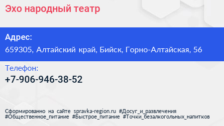 Эхо, народный театр по адресу 659305, Алтайский край, Бийск, Горно-Алтайская, 56 в дальнейшем Организация, размещена в следующих категориях: