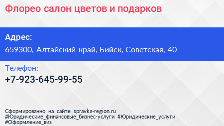 Флорео, салон цветов и подарков по адресу 659300, Алтайский край, Бийск, Советская, 40 в дальнейшем Организация, размещена в следующих категориях:
