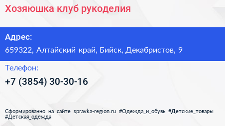 Хозяюшка, клуб рукоделия по адресу 659322, Алтайский край, Бийск, Декабристов, 9 в дальнейшем Организация, размещена в следующих категориях:
