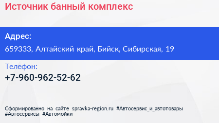 Источник, банный комплекс по адресу 659333, Алтайский край, Бийск, Сибирская, 19 в дальнейшем Организация, размещена в следующих категориях: